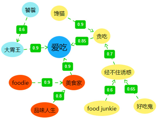 In the process of brand communication, many synonyms will evolve. For example, “loving to eat” (爱吃) has the following synonyms in Chinese: “爱吃”(loving to eat), “饕餮”(glutton), “美食家”(foodie), “好吃鬼”(foodie), “贪吃”(gluttonous), “大胃王”(hungribles), “谗猫”(calumny cat), “经不起诱惑”(unable to withstand temptation), “品味人生”(taste life), “foodie”, “food junkie”. The last tow English words are used as the foreign words. If they are all included in the BI KG, the KG structure will be complex and the brand concept will be scattered, which will interfere with the exploration of brand strategy. Therefore, the Knowledge Integrator part maintains synonym KGs, taking “loving to eat” for example, as shown in Figure 7. Due to the complexity of brand vocabulary semantics, the synonym KGs are currently mainly completed by industry experts.