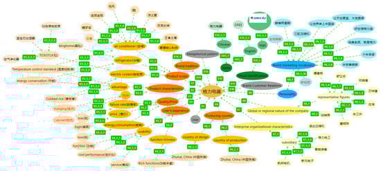 Take the results of the Apriori based on KG as reference. The experts make the following decisions: (1) Add “挂式” and “柜式” into the BI management KG of GREE. Because there is no suitable secondary ontology for them, a new secondary ontology “style” is also be supplemented under the product characteristics attribute. The updated KG is shown as Figure 7. (2) Although “美的” and “星巴克” have higher confidence, they are not added to the KGs, because in accordance with China’s Advertising Law, comparative propaganda should be avoided [27]. (3) The “复活”, “财报” and the left words are not added to the KGs, because they are related to the timeliness time, cannot reflect the essence of the brand, and do not have sustainability.