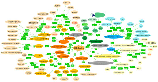 Figure 9 shows the KG of Luckin Coffee on 30 November 2022. The brand vocabulary of Luckin Coffee changes rapidly. The new added words include the name of new coffee products, “冰萃咖啡”(iced coffee), “生椰拿铁”(raw coconut latte), “厚乳拿铁”(thick milk latte), “陨石拿铁”(meteorite latte), the name of new product spokesperson, “谷爱凌”(Gu Ailing), “肖战”(Xiao Zhang). According to the experts’ suggestions, the Knowledge Integrator reserved the name of the former brand spokesperson, because the brand spokesperson has been updated very quickly, and the former brand spokesperson still has a strong correlation with the brand in the minds of consumers.