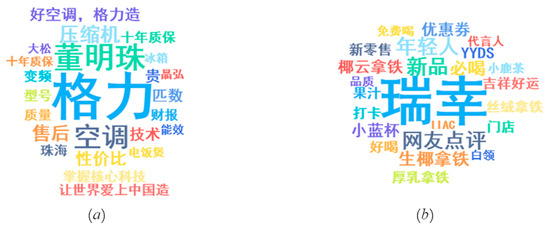 The Word Clouds of the Results of BI Evaluation Model Based on KG and Two-dimensional Bag-of-words. (a) the Word Cloud of GREE Electric. (b) the Cord Cloud of Luckin Coffee.