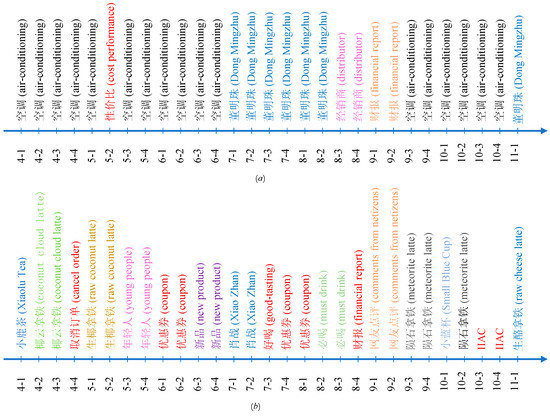 The Timelines of the Second Most Frequent Words Weekly. (a) the Timeline of GREE Electric. (b) the Timeline of Luckin Coffee. The words in the brackets next to each Chinese word are its meaning notes in English.