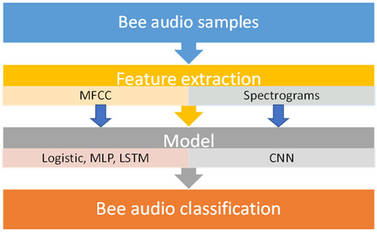 - Žgank, A. Acoustic Monitoring and Classification of Bee Swarm Activity using MFCC Feature Extraction and HMM Acoustic Modelling. In Proceedings of the ELEKTRO 2018, Mikulov, Czech Republic, 21–23 May 2018. [Google Scholar] [CrossRef]