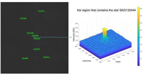 An image containing single-event transient bright clusters captured by the CMOS image sensor is shown in Figure 4a. The shapes and gray values of these transient bright clusters appeared to be similar to stars, as can be seen in the figure. The average value of the gray value of each position of the 3 × 3 window centered on the maximum value was calculated. They were taken as the gray values of the single-event transient clusters in the follow-up experiment. These clusters were randomly added to the star map detected by the unirradiated image sensor. The star map after the addition of the transient star clusters is shown in Figure 4b.