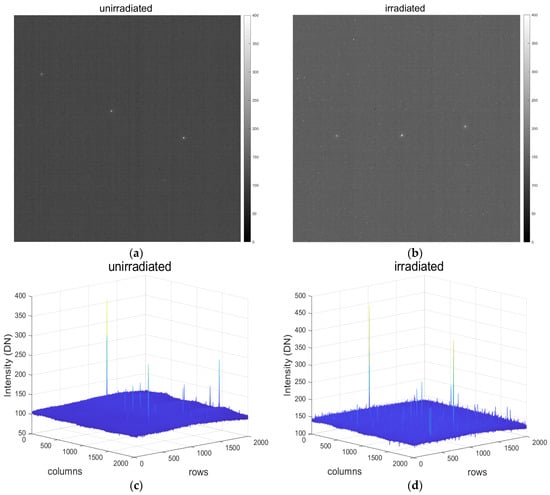 Figure 3a,b show respectively images of the Orion’s Belt captured by star sensor test systems with unirradiated CMOS image sensor and irradiated with a fluence of 1.47 × 1010 p/cm2. The nonuniformity of the image taken by the irradiated CMOS image sensor was significantly greater compared to that of the unirradiated CMOS image sensor. Figure 3c,d show 3D point maps constructed from star maps that have been processed with low-pass filtering. The star map acquired by the unirradiated CMOS image sensor was smooth, except for the stars’ region, while the star map taken by the CMOS image sensor with an irradiation fluence of 1.47 × 1010 p/cm2 still had many spikes, even after the filtering process.
