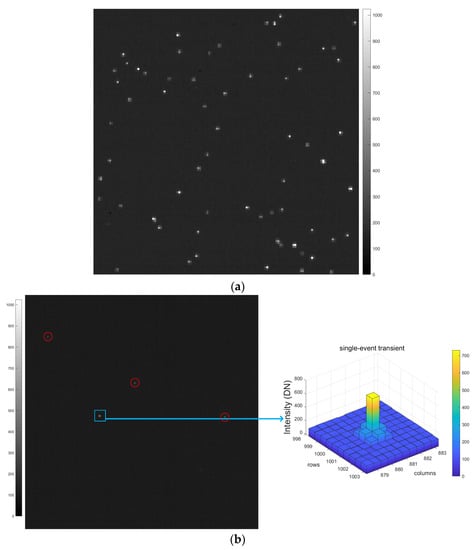 - Beaumel, M.; Hervé, D.; van Aken, D.; Pourrouquet, P.; Poizat, M. Proton, electron, and heavy ion single event effects on the HAS2 CMOS image sensor. IEEE Trans. Nucl. Sci. 2014, 61, 1909–1917. [Google Scholar] [CrossRef]