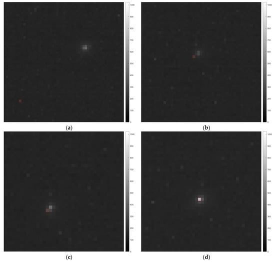 The reason for the wrong identification results for some of the triangular and pyramidal structures at a proton irradiation fluence of 1.47 × 1010 p/cm2 was related to the hot pixels. In previous research, it was discovered that the noise caused by the total ionizing dose effect can lead to an increase in star centroid positioning error through the diagonal distance relationship between star pairs [19]. However, the hot pixels generated by the displacement damage can have a greater impact on the star centroid positioning accuracy. In the star maps taken by the CMOS image sensor with a proton irradiation fluence of 1.47 × 1010 p/cm2, the initial position of a star in relation to a hot pixel is depicted in Figure 5a. Here, the red box is the hot pixel, which is far away from the star and does not affect the accuracy of star centroid positioning; however, the position of the star in the star map was changed by the rotation of the Earth, and thus the hot pixel gradually came closer to the star (Figure 5b–d). The distribution of the grayscale value of the star was also changed.
