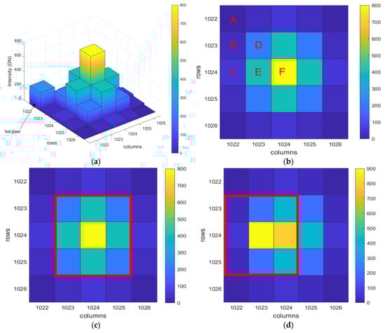 According to the symmetry of the distribution of the star grayscale value and the size of the centroid positioning window, there are six cases of the influence of the hot pixels on the distribution of the star, as shown in Figure 6b. Among them, the F case mainly changed the Gaussian dispersion radius. For the cases D and E where the hot pixel was within the original window, the change of the grayscale value in the window led to an error of the centroid positioning of the star. When the grayscale value of a hot pixel was lower than that at the center of the star, the centroid positioning window remains the same as shown in the red box in Figure 6c. However, if the grayscale value of the hot pixel was higher than that of the center of the star, the center of the positioning window shifted to the location of the hot pixel. This is shown in Figure 6d. For cases A, B, and C outside the window, centroid positioning error will occur only when the grayscale value of the hot pixel is higher than the grayscale value of the star center.