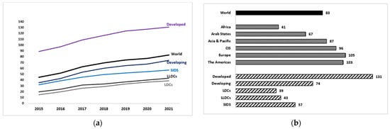 According to ITU [], the deployment and utilization of MBB have witnessed significant growth over the years. As summarized in Table 2, the number of active MBB subscriptions worldwide has grown by up to 99% when data from year 2015 and 2021 are compared. This growth is even more significant in least developed countries (LDCs), being up to 198%. For the country groupings in Table 2, the other acronyms LLDC and SIDS represent land-locked developing countries and small island developing states, respectively. The growth trend per 100 inhabitants is graphically illustrated in Figure 1a, where it can be observed that there is a huge gap between broadband penetration in developed countries and the rest of the world.