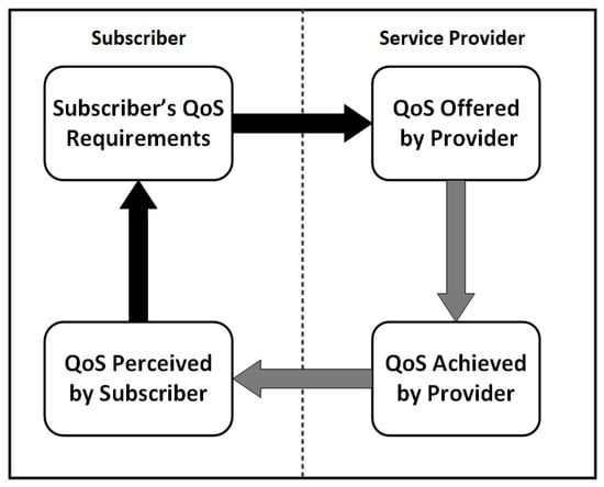 Quality of Service (QoS) is a term that is broadly used in the telecommunication world but increasingly gaining traction with regards to MBB. QoS is the overall quality of the applications experienced by the network users. According to the ITU [,], “Quality of Service (QoS) is the totality of characteristics of a telecommunications service that bear on its ability to satisfy stated and implied needs of the user of the service”. Therefore, end-to-end latency, jitter, packet loss and throughput are key QoS parameters adopted to measure the performance of MBB networks []. From Figure 2, QoS has four points of view when adopted within the concept of service quality. The four points of view include QoS offered by provider, QoS achieved by provider, QoS perceived by subscriber, and the subscriber’s QoS requirements []. The subscriber’s QoS requirements state the level of quality that a specific service requires, which may be expressed in non-technical languages with the subscribers particularly concerned about the resulting end-to-end service quality and not the internal design of the network. QoS offered by the service provider accounts for the level of quality expected to be offered to the customer by the service provider, which maybe expressed in non-technical terms for customers to understand, and in technical terms for use within the business. QoS perceived by the subscribers expresses the level of quality experienced that the subscribers believe they have experienced, which is usually expressed in terms of degrees of satisfaction and not in technical terms. QoS achieved by the service provider accounts for the level of quality truly achieved and delivered to the subscribers, which is used by the industry and sometimes by regulators, for publication in the interests of subscribers [].