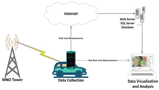 To measure the MBB performance delivered to the end user, a systematic end-to-end approach is usually preferred []. In some cases, a dedicated testbed is developed while in other cases, simplified methods that use software and mobile applications are adopted. Regulatory agencies, operators or independent researchers can carry out drive tests and walk tests to identify coverage gaps and performance problems. The major disadvantages of these kinds of tests are high costs and poor scalability [,]. Another approach is to depend on the end user to initiate performance measurement by visiting a website or by running performance measurement applications preinstalled on their mobile device []. Even though this method is scalable, there can arise issues of privacy, and bias in measurements by participants. Additionally, this method often lacks vital context information and metadata that is essential in putting the MBB measurement result in the right context.