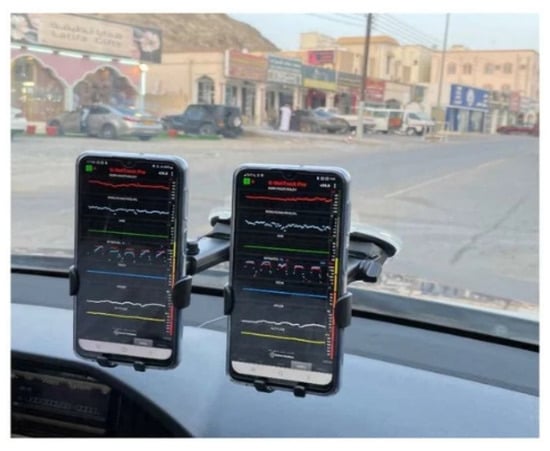 The first is a user equipment-based testing where measurements are performed using a typical user-equipment such as smart phones. The second method engages specialized receivers for measurement and benchmarking [,]. There is no defined methodology or standard for conducting a drive test. However, Figure 3 shows a typical configuration of drive test []. Usually, an MBB testing application is installed in identical smartphones, each dedicated to a particular MNO as shown in Figure 4 []. The smartphones are mounted in a moving vehicle and programmed to take measurements while the vehicle is in motion and to evaluate several performance metrics relating to user experience. The data collected are stored in the mobile device, which are retrieved and analyzed in real time or at the end of the measurement campaign. The major disadvantage of this kind of MBB measurement is that it is expensive and may not be scalable.