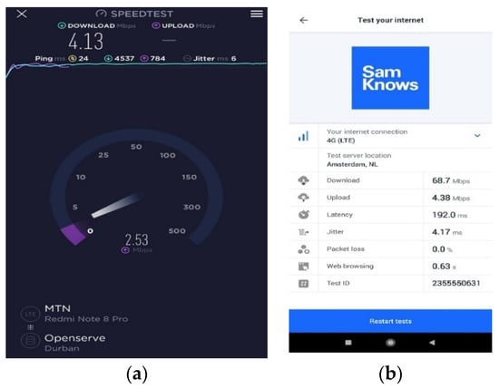 SamKnows is also a well-known network performance company that develops MBB crowdsourced measurement applications as one of its products []. The SamKnows mobile application app supports MBB performance in six main categories: download speed, upload speed, latency, packet loss, web browsing and YouTube streaming MBB measurement. It can also record passive metrics such as signal strength of the connection and device manufacturer, type and model. However, for this app, the test can be conducted anonymously on its own at timed intervals [,]. SamKnows’ crowdsourced app is modular, allowing regulators to easily customize the app for quick MBB speed assessment. SamKnows also collaborate to develop custom-made apps for regulators such as the FCC speed test app []. Figure 6b shows the interface of the mobile application, which is supported by both Android and iOS-based smartphones.