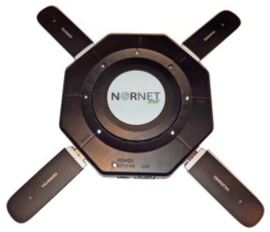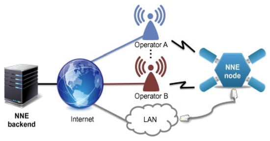 The Nornet Edge (NNE) platform is a testbed dedicated to the measurement and study of MBB networks and is presented in [,,]. Figure 7 shows the overview of the testbed for MBB experiments. Renowned as one of the largest infrastructures in the world for MBB measurements, the NNE has over 400 fully programmable and multi-homed nodes shown in Figure 8, placed at different locations in Norway. The NNE measurement nodes comprise custom-made single-board computers running a standard Linux operating system that allow 2–5 MNOs to be connected to it using MBB modems. The node is equipped with a Samsung S5PV210 Cortex A8 1 GHz processor with 512 MB RAM, 512 MB NAND flash memory and a 16 GB SD card for storage. Sets of servers form a central backend system for collection and storing data on the NNE platform. There is also an algorithm designed to manage the nodes and run measurements for a long time on a national scale. The platform allows for the collection of status information from the modems on mobile broadband cell ID, connection mode and signal strength.