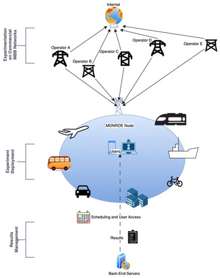 - Alay, O.; Lutu, A.; García, R.; Peón-Quirós, M.; Mancuso, V.; Hirsch, T.; Dely, T.; Werme, J.; Evensen, K.; Hansen, A.; et al. MONROE, a distributed platform to measure and assess mobile broadband networks: Demo. In Proceedings of the Tenth ACM International Workshop on Wireless Network Testbeds, Experimental Evaluation, and Characterization, New York, NY, USA, 3–7 October 2016. [Google Scholar] [CrossRef]