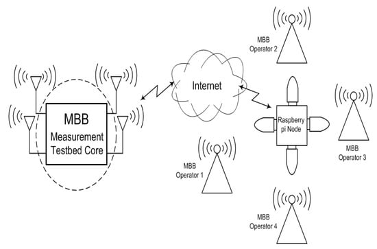 A simplified testbed for MBB performance evaluation that follows the setup of the NNE albeit using easily sourced commercial-off-the-shelf (COTS) devices is presented in [,]. Figure 10 shows the overall system architecture with the Raspberry Pi forming the core of the remote MBB measurement node. The Raspberry Pi 4 with 64 quad-core Cortex-A72 processors and 2GB Low-Power Double Data Rate (LPDDRA) RAM on its board is used for the node. The testbed uses USB modems and retrofitted WiFi to connect up to 4 MNOs for 3G and 4G MBB networks, respectively. The Raspberry Pi nodes are configured with the 4-way 5V relay modules mounted and an executable script written in python to achieve multihoming for 3G and 4G MBB measurements. The node autonomously initiates the measurement at regular intervals and stores the information, which an authorized user can access remotely at the testbed core for evaluation. This simplified MBB testbed is not as sophisticated as NNE; however, it can measure the key MBB performance metrics over an extended period.