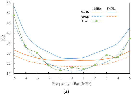 Variation of JSR when the UAV’s data link loses lock in presence of EMI signal with typical parameters: (a) JSR varies with frequency offset of EMI when the bandwidths of WGN and BPSK are 1 MHz and 8 MHz and (b) JSR varies with the EMI bandwidth when the center frequencies of WGN and BPSK are , , .