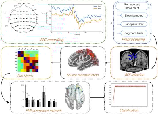 Flowchart of the proposed framework. The pipeline contains seven major steps: EEG recording, data preprocessing, ROI selection, source reconstruction, PMI matrix, PMI connection network, and FCN classification.