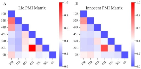 (A) The average PMI adjacency matrix of the lying group. (B) The average PMI adjacency matrix of the innocent group. The diagonal is conventionally set to 0 for all nodes. Only the lower half of the adjacency matrix is shown, which is due to PMI’s symmetry.
