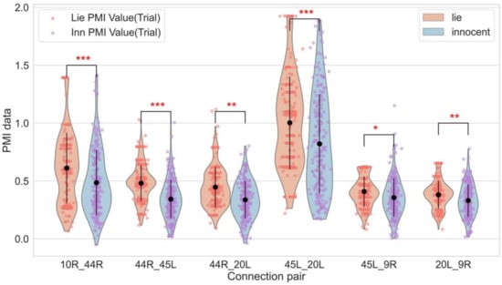 Six PMI connection pairs with significant differences between the lying and honest groups. A violin plot is utilized to depict the probability density distribution of PMI values for each connection pair among the two groups of subjects. Black dots and error bars indicate the means ± SD in each group, whereas colored dots indicate trial-level estimates (n = 100/315 trial). p values are indicated by stars: * p < 0.05, ** p < 0.01, and *** p < 0.001.
