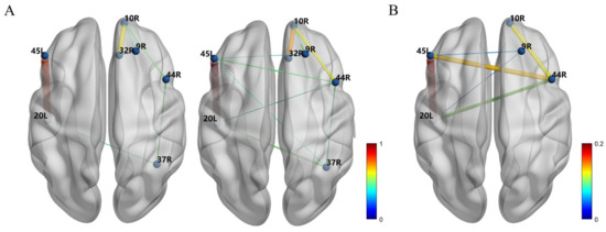 Considering the statistical results of connection edges, the topography of the PMI matrix for the innocent group (Figure 5A) and the lying group (Figure 5B) are shown below, respectively. For better visualization, only connection edges with PMI values greater than 0.4 have been drawn. Concerning the topography shown in Figure 5, the blue nodes represent the center points of each brain region obtained by the K-means algorithm, and the connection lines of different colors and thickness represent the connection strength of each brain area, which means the intensity of information exchange. Specifically, compared to the lying group, the distribution of strong connectivity values between ROIs in the innocent group is more sparse. The innocent group had six edges, and the lying group had ten edges. Moreover, in the lying group, there was a greater degree of information transfer between the left and right hemispheres of the brain. This was demonstrated by a higher distribution of functional connection values between hemispheres, including connections such as 20L-44R and 45L-44R, among others. In addition, Figure 5B depicts the topography of the difference matrix for comparison. Only connection edges with significant differences have been drawn. There are three functional connections from the frontal region to the frontal region (10R-44R, 45L-9R, 45L-44R), and three functional connections from the frontal region to the central region (45l-20L,9R-20L,44R-20L).