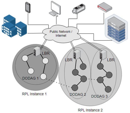 The Internet of things (IoT) provides a big picture and foundation for a new era. Diverse types of “things”, ranging from tiny chip-embedded physical objects to powerful computers, are allowed to connect and communicate with each other through the IoT []. The IoT has attracted plenty of application implementations and protocol designs from industry and academia []. Applications can run on the IoT, along with a set of supporting technologies, such as designated modifications of IPv6, network stacks with light-weight requirements for hardware, etc. Currently, there are still open issues in several areas, such as interoperation with different networks, heterogeneity adaption resolutions, efficient routing with hardware constraints, transmission security, and so on [,]. There are plenty of categories of IoT networks, among which the low-power and lossy network (LLN) was considered as a key target network scenario by the Routing over Low Power and Lossy Network Working Group (ROLL WG) of the Internet Engineering Task Force (IETF) (https://datatracker.ietf.org/wg/roll/about/ (accessed on 5 February 2023)), which is an essential building block in the IoT-based infrastructure [].