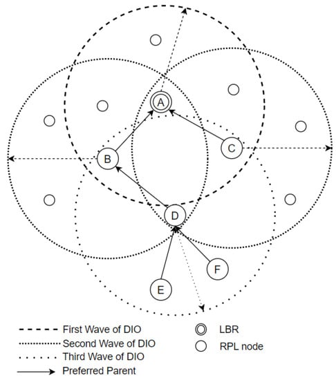 RPL is designed to enable joined nodes to perform three types of communications. Initially, LBR broadcasts the initial DODAG information object (DIO) message [] to start establishing RPL topology. There is a lot of information involved in DIO to complete an instance; specifically, an instance number, DODAG ID, version number, and objective function [] are decided in that initial DIO. Objective function is a method used by nodes to determine their ranks, which logically represent relative positions to LBR. In the general case, the calculation of rank is related to quality of service [,].