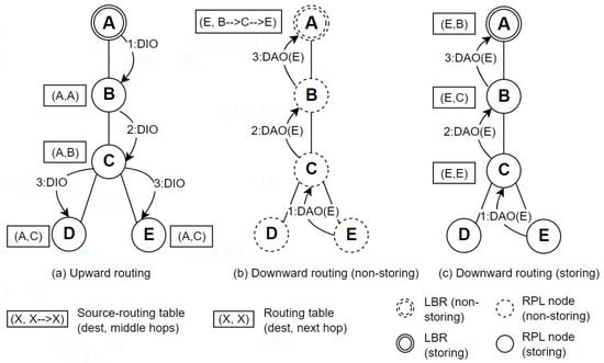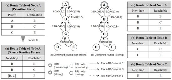 First, a DAO initialized by the originator contains: (1) the ID of the originator of the DAOs set (contained in TO, and the child is the originator node itself in this case); (2) the ID of the preferred parent of the originator (contained in TIO). Second, a DAO transmitted through a forwarder contains the same as that of the originator (because it is just a simple forwarding). Third, a DAO made by a producer contains: (1) the ID of the originator of the DAOs set (contained in TO, and the originator is a child of the current forwarder); (2) the ID of the preferred parent of the current producer (contained in TIO). Last, an example of detailed two types of downward routing schemes in RPL is illustrated in Figure 5.
