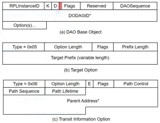 TB-RPL slightly modified the original DAO format to fit the proposed functions. The modified DAO format is shown in Figure 4. The Flags is an 8-bit undefined field reserved for future use, which benefits our design exactly. The first bit in that field is used to indicate whether it is a weak DAO message. That is the only modification of the standard DAO format. The components of DAO, as well as the combination of options, are the foundation of the whole process. In the RPL standard, a DAO message format consists of a base object along with several other options. These options include target options (TO) and transit information options (TIO), in which both options can be more than one.