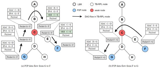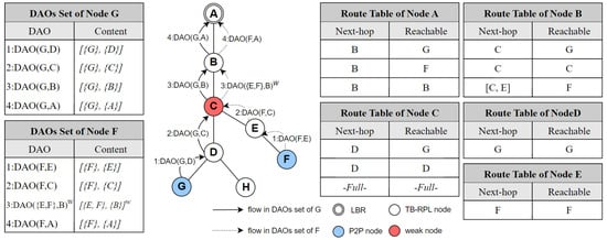 In Figure 5b, node E is the originator, nodes C and B are producers, and node A is the root. “1:DAO(E, C)” here means the originator of the whole DAOs set is node E, and the preferred parent of the originator is node C. “2:DAO(E, B)” means that the originator is node E and the preferred parent of the current producer is node B. “3:DAO(E, A)” indicates that the originator is node E, and the preferred parent of the current producer is node A.
