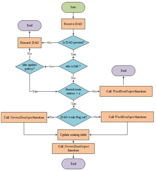 For comparison, in the storing mode of standard RPL, when a node’s memory is full and cannot store more routing entries, the new coming DAO will be just discarded. Then, the node will not send any consequent DAOs to its preferred parent, while, in our proposed work, the designed content in a designated order is contained in DAOs to solve that problem.