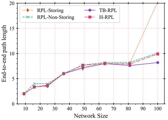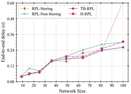 Obviously, the non-storing mode of RPL still keeps the longest end-to-end-delay, except for that in storing mode, after the network size is greater than 81 nodes. The other two RPL mechanisms continuously perform fine because LBR still helps store the downward routes. However, the MOPs switch in H-RPL clears up all the route tables of middle nodes. Then, it works in the non-storing mode, which drives its delay nearly to that of the non-storing mode of RPL. Finally, TB-RPL outperforms them all, and keeps the lowest end-to-end delay.