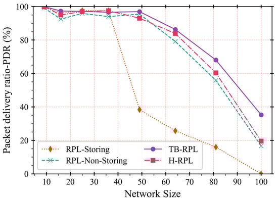 Figure 12 describes the end-to-end PDR of UDP packets. PDR could usually indicate the connectivity between two nodes, which is a different dimension from the previous two metrics. Path length and delay concern the statistics of packets that have already arrived destinations successfully; they do not pay attention to the lost packets. The PDR metric covers the considerations of lost packets. It could be learned from the result that the end-to-end PDR of all kinds of RPL decrease when the network size increasing. This is because the more nodes, the greater the number of packets, including data packets and control messages, which travel through the network. A large enough number of packets would produce network congestion, which prevents the packets arriving at destination correctly. Before the network size arrives at 36 nodes, the non-storing mode of RPL results in the worst end-to-end PDR. It is again caused by the long-path problem. The longer the path length, the greater the number of transmissions and retransmissions. Consequently, network congestion is more likely to occur.