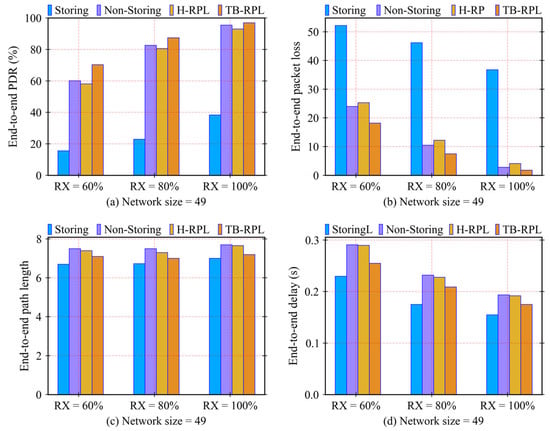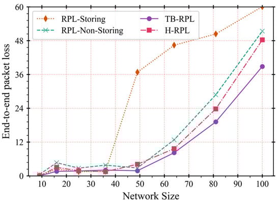 In Figure 14b, the end-to-end packet loss metric is evaluated. The situation and trend are almost the reverse of that of PDR metric, so their conclusions are logically consistent. TB-RPL outperforms the other three RPL modifications. However, there is a scenario in both Figure 14a,b worth further discussion, where the performances of the storing mode drop drastically when the values of α decrease. The reason is that the values of α (those are 4, 8, and 16) are too small to compare with the network size of 49 nodes. Consequently, some common parents of the P2P pair of nodes are full of the memory to store routing information. Especially for that common parent very near to the LBR, the probability to lose a child’s downward routing information is drastically high.