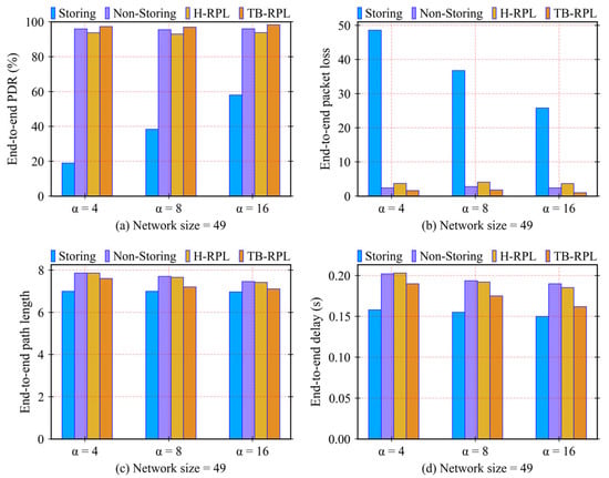 Figure 14 illustrates the group of different values of α, such as 4, 8, and 16. The transmission range is 70 m and the receive success ratio is 100%. From the results shown in Figure 14a, the worst end-to-end PDR is always maintained by the storing mode of RPL. This is because for all the three subgroups of evaluation, the memory for route entries of plenty of nodes has already been filled. In these cases, the children-unreachable problem in the storing mode occurs, so the PDR decreases heavily. Specifically, when the α equals 4, it indicates that the memory space for the route table is much more limited, so the PDR is much lower than that of the non-storing mode. When the values of α are 8 and 16, they behave by the same logic; however, the children-unreachable problems are comparatively in the milder degrees. For the other three RPL implementations, the PDRs of which are almost the same with different values of α because the memory space limitations of middle nodes do not affect the PDR performance of the non-storing mode, as well as TB-RPL and H-RPL.