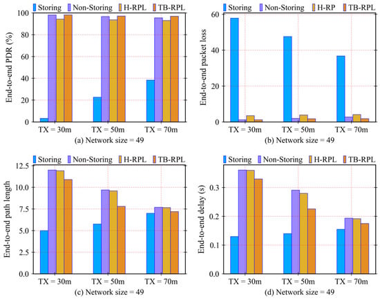 In Figure 15b, the results of packet loss follow the same analysis and discussion as those in the above cases. Figure 15c,d verifies the situations with respect to path length and end-to-end delay metrics. For the storing mode, the path lengths rise slowly along with the transmission ranges expanding from 30 m to 70 m. The reason is that with more limited memory space for overall nodes, there is a higher probability that the route with shorter end-to-end path length would be stored completely. For the non-storing mode of RPL, the higher the transmission range, the lower the path length. The is because the higher the transmission range, the fewer levels in DODAG. In this case, the hops between parent to child are decreased, so the path length becomes lower. TB-RPL and H-RPL obey the same logic as the above subgroups, and TB-RPL still outperforms the others. The results of end-to-end delay follow a similar analysis and discussion.
