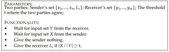 Erkam Uzun et al. [19] proposed fuzzy labeled private set intersection with applications to the private real-time Biometric Search. The communication of this protocol is sublinear in database size and is concretely efficient. This scheme combines secret sharing and homomorphic encryption to achieve biometric identification in two parties. This scheme is efficient, but unfortunately cannot be directly applied to our scenario. The solution is to make a judgment on the set and return the result, and the labels cannot be exchanged. Kelong Cong et al. [20] proposed labeled PSI from homomorphic encryption with reduced computation and communication. Hao Chen et al. [21] proposed labeled PSI from fully homomorphic encryption with malicious security based on [22]’s proposed protocol. However, Kelong Cong et al. and Hao Chen et al.’s work is more focused on unbalanced PSI. Saikrishna Badrinarayanan et al. [23] proposed a multi-party threshold private set intersection with sublinear communication. At the same time, it also realized the two-party threshold PSI. Gayathri Garimella et al. [24] considered the general notion of an oblivious key–value store (OKVS) to encode input sets and constructed a new private set intersection protocol. They have good performance, but the labels cannot be exchanged.