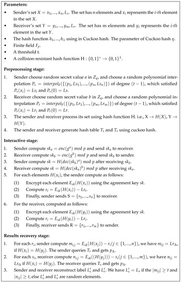 Given two sets and , generates secret sharing and for and . Then, the F algorithm inputs the set M and N, which is the encrypted set by the key generated by the algorithm, and outputs the sets R and S. Finally, R and S are input into the algorithm, and the output is OR ⊥. The details of the four algorithms are as follows.