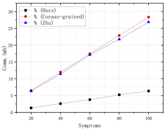Table 4 and Figure 4 compare our protocol with Jiang et al. [5] and Zhu et al.’s [30] work. From Table 4 and Figure 4, we can find that with the increase in the number of symptoms, the communication cost is also increasing. This is the same in all three scenarios. However, specifically, for different numbers of symptoms, our scheme has a much lower communication cost than the other two works. For example, when the number of symptoms is 60, the traffic of our scheme is 3.78 MB, while the other two works have values of 17.44 MB and 17.32 MB, respectively. Our protocol communication cost has almost been reduced by half, which is particularly applicable to IoT devices.