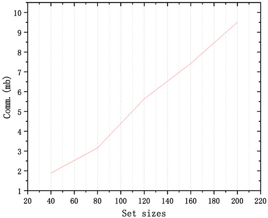 We evaluated the cost of different collection sizes (the size of the elements in the collection is equal to the sender’s data plus the receiver’s collection elements), as shown in Figure 5 and Figure 6. We found that the protocol overhead increases with the increase in collection elements, as shown in Figure 5 and Figure 6. This is consistent with the previous discussion, indicating that our protocol is applicable to balanced or unbalanced sets and has strong flexibility.