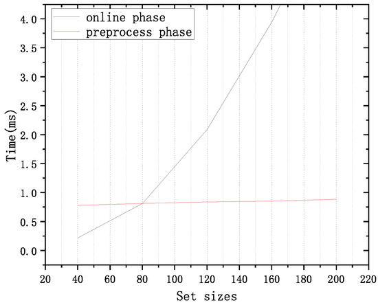 For different data sizes of the receiver and sender, Table 5 illustrates the time and communication costs, respectively. From Table 5, we can see that the computational and communication cost of the STLPSI protocol online phase increases with the set size. However, compared with the change in communication cost in the online phase, the time cost has little change. For example, when the set size is 30 (the sum of the number of sender sets and receiver sets), the online communication overhead is 1.41 MB, and when the set size is 100, the communication overhead is 4.72 MB, an increase of . The time cost only increases from 0.78 ms to 0.812 ms, which is only a increase.