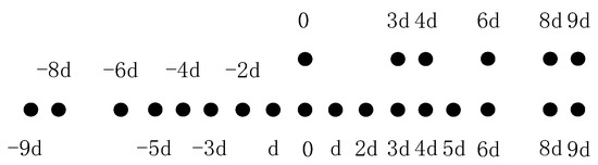 The coprime array is a nonlinear array. The array is formed by combining two subarrays. The number of elements of the two subarrays satisfies the mutual quality relationship. One antenna array has N receivers and another antenna array has M receivers. There is a mutual-quality relationship between M and N. A one-dimensional coprime array shown in Figure 1 is formed by the combination of two uniform arrays. Subarray arrays with N receivers are spaced Md apart, and subarray arrays with M receivers are spaced Nd apart. The two subarrays share the first array element. Then, the coprime array has a total of M + N – 1 array elements in each half coordinate. The position of the array elements can be represented by the set L.