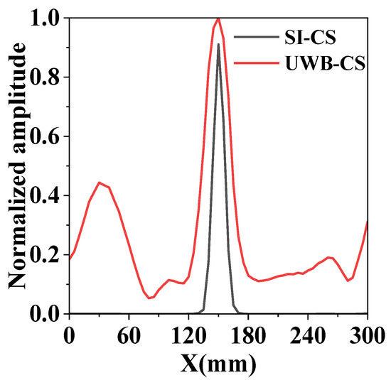 The imaging results of UWB-CS and SI-CS obtained from the sensor data with SNR = 20 dB are shown in Figure 5. From the results (a) and (b), we can see that both methods can accurately locate the set PIM source. However, the results obtained by the SI-CS method have a smaller imaging spot range at the PIM source location. At the same time, the SI-CS method obtains imaging results with smaller paraflaps and smoother imaging results. The computation time of UWB-CS and SI-CS is 717.49 s and 173.08 s. The trend of the peak in the lateral direction at the PIM source location for the UWB-CS method and the SI-CS method is plotted in Figure 6. By comparison, it can be found that the area of the SI-CS peak imaging section is only 16% of that in the UWB-CS method. This allows SI-CS to characterize the PIM source location more precisely.