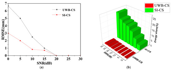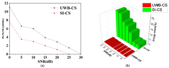 (a) The RMSEs of the UWB-CS method and the SI-CS method. (b) The energy share of the UWB-CS method and the SI-CS method.