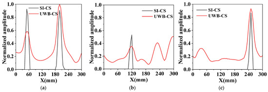The imaging results of UWB-CS and SI-CS obtained from the sensor data with SNR = 20 dB are shown in Figure 10. As we can see from the results in Figure 10a,b, both methods can form peaks at the PIM sources. However, the imaging results of the SI-CS method have a narrower range of half-peak widths at the target locations of the two PIM sources and flatter imaging results at the non-target source locations. Computation time of UWB-CS and SI-CS is 716.85 s and 174.37 s. The trend of the peak in the lateral direction at the PIM source location for the UWB-CS method and the SI-CS method is plotted in Figure 11. By comparison, it can be found that the area of the SI-CS peak imaging section is only 25% compared to the UWB-CS method. This allows SI-CS to characterize the PIM source location more precisely.