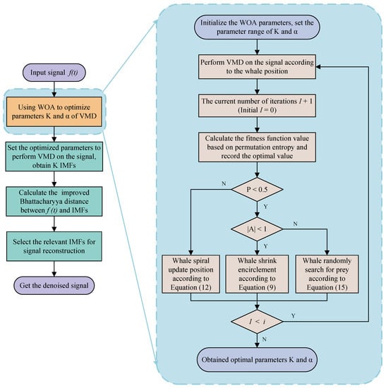 - Input the signal . Initialize the parameters of the WOA, and set the ranges of parameters within the VMD method.