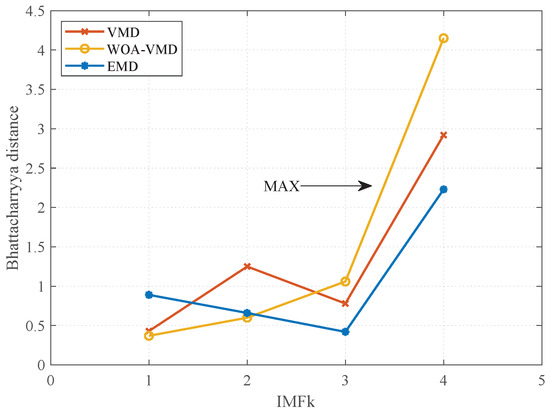 The SNR of the mixed signal after decomposition and recombination evaluates the noise reduction performance. The improved BD between the mixed signal and the IMFs decomposed by the VMD method, WOA-VMD-BD method, and EMD method (corresponding to Figure 3, Figure 5, and Figure 6, respectively) is calculated. When manually setting parameters [K, ] = [4, 1000] at random for VMD, the BD between the 4 IMFs and the mixed signal are [0.43, 1.25, 0.78, 2.92]. After optimization by the WOA, set the parameters [K, ] = [4, 3319] when VMD is performed, the BD is [0.37, 0.60, 1.06, 4.15]. The BD of the four IMFs after EMD and the mixed signal is [0.89, 0.66, 0.42, 2.23]. Figure 7 shows the line diagram of the BD. The abscissa IMFk in the figure represents the serial number of the IMF. According to Equation (23), the maximum slope of the two adjacent BD was selected as the demarcation point, and the first three IMFs were selected for signal recombination.