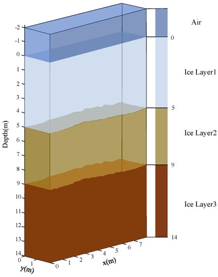 In this paper, a three-dimensional model with a size of 8 m × 16 m × 2 m was constructed, as shown in Figure 8. The model consists of an air layer and three ice layers. The thickness of the air layer is 2 m. The first layer interface represents the interface between the air and the ice layer 1, the ice surface where the radar survey line is located, at a depth of 0 m. The second layer interface represents the interface between ice layer 1 and ice layer 2, located at a depth of 5 m. The third layer interface represents the interface between ice layer 2 and ice layer 3, which is located at a depth of 9 m. In order to be closer to the actual situation, the interfaces between the ice layers were designed as rough interfaces with slight fluctuations. The relative permittivity of the three ice layers are 2.98, 3.05, and 3.16, respectively. The specific parameters are shown in Table 1.