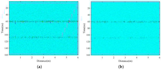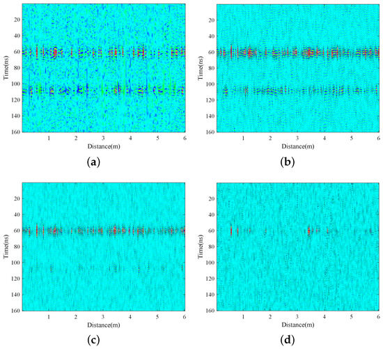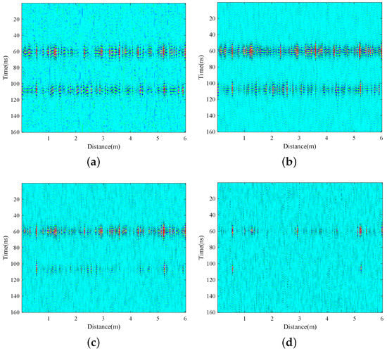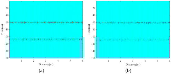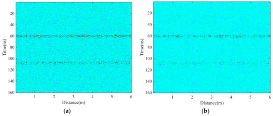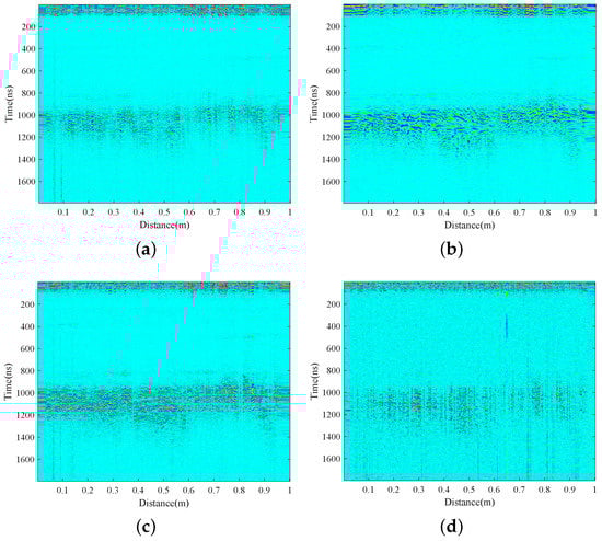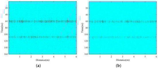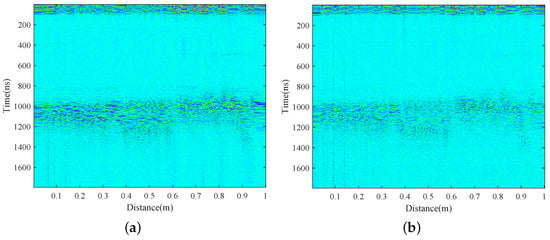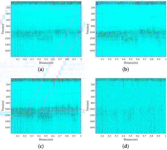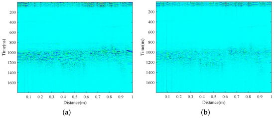 Figure 19 shows the on-site detection scene. The high-frequency channel antennas are installed at the bottom of the trolley, the low-frequency channel antennas are installed on both sides of the top plate of the trolley, and the electronic unit is installed inside the trolley. A host computer program controls the radar. The echo data received by the high-frequency channel was used in this experiment. The high-frequency channel uses 128 bit code elements, and the center frequency of the code element signal is 800 MHz, with a transmission signal frequency range covering 100–1400 MHz. The transmission power is 0.4 W, the reception window is 2.16 ns, the mixed sampling rate is 5.12 GHz, and the reception gain is 50 dB. The Botiew antenna is located 0.3 m above the ground, providing good antenna coupling and detection quality. The survey line length is 1 m, and the antenna offset is 0.001 m. The images of the collected data in HH and HV polarization modes after pre-processing, such as DC removal, gain, and zero-point correction, are shown in Figure 20.