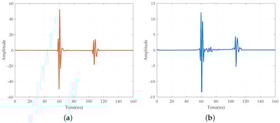 The center frequency of the simulated antenna is set to 500 MHz. The distance between the transmitting and receiving antennas is 0.1 m, and the antenna is located 0.3 m above the interface between the air and the glacier. The offset of the antenna is 0.04 m. The sampling frequency is 2.6 GHz. The time window of acquisition is 160 ns, and 150 channels of data are collected. Since the pseudo-random coded radar we used can collect data in HH polarization and HV polarization modes, the simulation experiment also collected data in two polarization modes. After preprocessing, such as direct wave removal, zero-point correction, and gain, the simulated glacier profiles collected in HH and HV polarization modes are shown in Figure 9. The 75th track of the two profiles is shown in Figure 10.