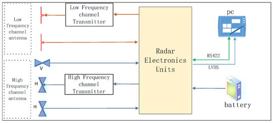 The experiment used a laboratory-built pseudo-random-coded UWB radar. The radar comprises electronic units, high-frequency channel transmitters, low-frequency channel transmitters, low-frequency channel antennas, high-frequency channel antennas, and cables. The schematic diagram of the radar device is shown in Figure 18.